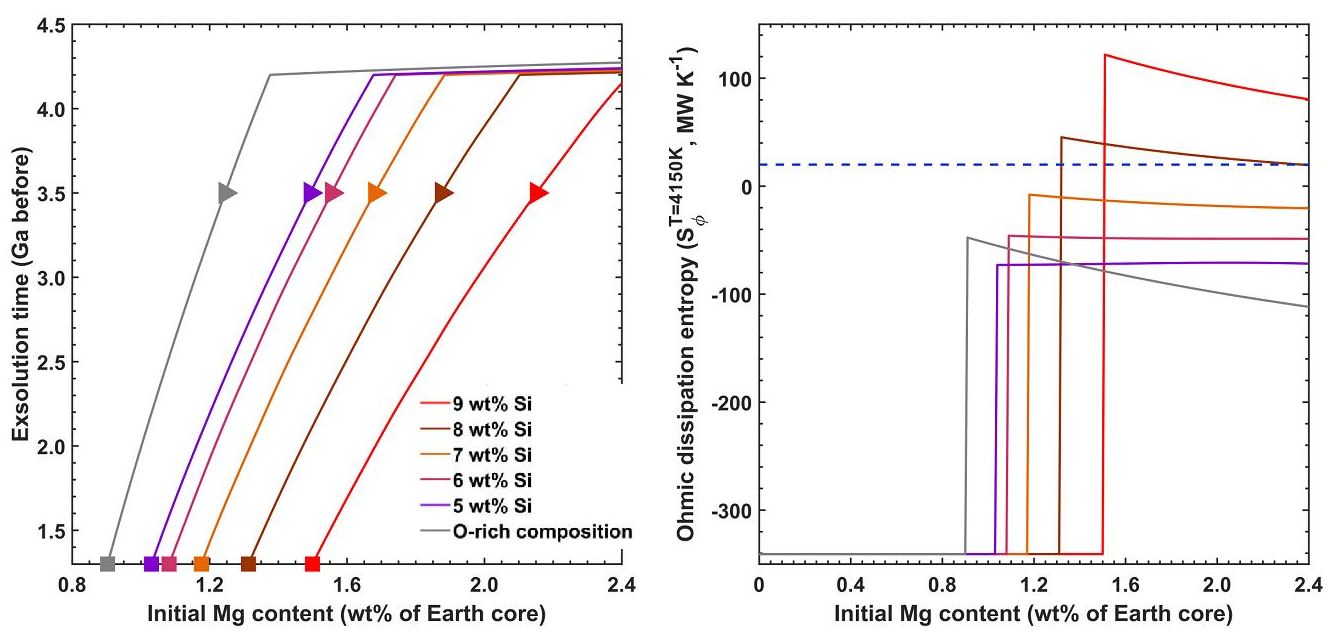 圖2 (a) 地核起始鎂含量與鎂析出時(shí)間關(guān)系。富氧地核的起始輕元素含量為5 wt% O以及2 wt% Si,其它起始地核輕元素含量由假設(shè)氧含量與硅含量具有固定比值2.7來決定。在固定起始地核成分情況下,鎂的含量越高鎂析出時(shí)間越早。三角代表在35億年前開始析出的情況。方塊代表在13億年前開始析出的情況。(b)地核起始鎂含量與鎂析出推動(dòng)地核發(fā)電機(jī)所產(chǎn)生的歐姆耗散熵關(guān)系。為推動(dòng)發(fā)電機(jī),至少需要20MW/K的歐姆耗散熵,對(duì)應(yīng)圖中的藍(lán)色虛線。當(dāng)起始硅含量大于8 wt%且起始鎂含量大于1.8 wt%時(shí),鎂可以在35億年前開始析出,并為地磁場提供足夠的能量。大于8 wt%的地核起始硅含量可以由木星土星大回轉(zhuǎn)模型(Grand Tack)產(chǎn)生。大于1.8 wt%的地核起始鎂含量可以由一個(gè)火星大小的大撞擊擠入起始地核中