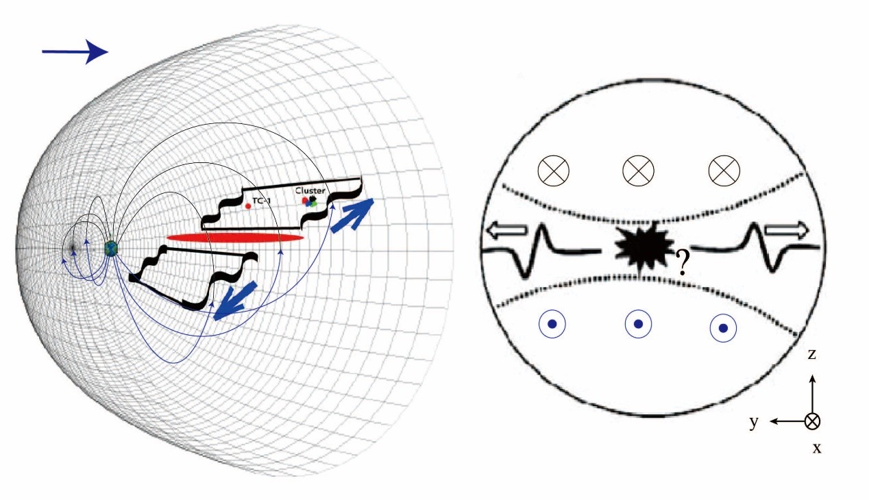 夜側(cè)的地磁場(chǎng)會(huì)被太陽(yáng)風(fēng)拉伸形成“磁尾”。磁尾上、下部分磁場(chǎng)近似反向,其赤道附近磁場(chǎng)反向過(guò)渡的區(qū)域被稱(chēng)為磁尾電流片。地球磁尾電流片是磁層物理活動(dòng)最活躍的區(qū)域,也是地磁擾動(dòng)的激發(fā)區(qū)域,因此通常不是處于靜態(tài),而是處于上下擺動(dòng),或“拍動(dòng)”狀態(tài)。