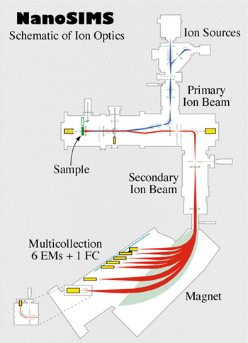 | Cameca NanoSIMS 50L型二次離子探針質(zhì)譜儀與傳統(tǒng)的二次離子探針質(zhì)譜儀(Secondary Ion Mass Spectrometry, SIMS)的工作原理類似。 左圖為NanoSIMS 50L的離子光學(xué)示意圖。 它首先將離子源(Ion Sources)產(chǎn)生的一次離子,加速形成能量為1-20KeV的一次離子束(Primary Ion Beam),接著用一次離子束照射固體樣品(Sample)表面,激發(fā)(濺射)出正、負(fù)二次離子(Secondary Ion Beam),再利用磁場(Magnet)分離具有不同質(zhì)荷比的二次離子,然后用法拉第杯(FC)或電子倍增器(EM)測量它們的強(qiáng)度,最后通過測量值計(jì)算固體表面所含元素及同位素的豐度。 |