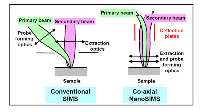 Cameca NanoSIMS 50L型納米離子探針相比于傳統(tǒng)的離子探針具有較高的靈敏度和極高的空間分辨率,這主要得益于Cameca公司對NanoSIMS 50L型納米離子探針?biāo)龅母倪M(jìn)。把原來的一次離子傾斜入射改成垂直入射,并使一次離子流和二次離子流共同使用一套共軸透鏡系統(tǒng)(見下圖)。一次離子流垂直入射可達(dá)到縮小束斑直徑(即提高空間分辨率),增加離子束亮度,減小儀器掃描成像失真度的目的。使用共軸透鏡系統(tǒng)大大縮短了接收二次離子的浸沒透鏡與樣品表面間的距離,進(jìn)而顯著提高二次離子流的接收效率以及儀器的靈敏度。