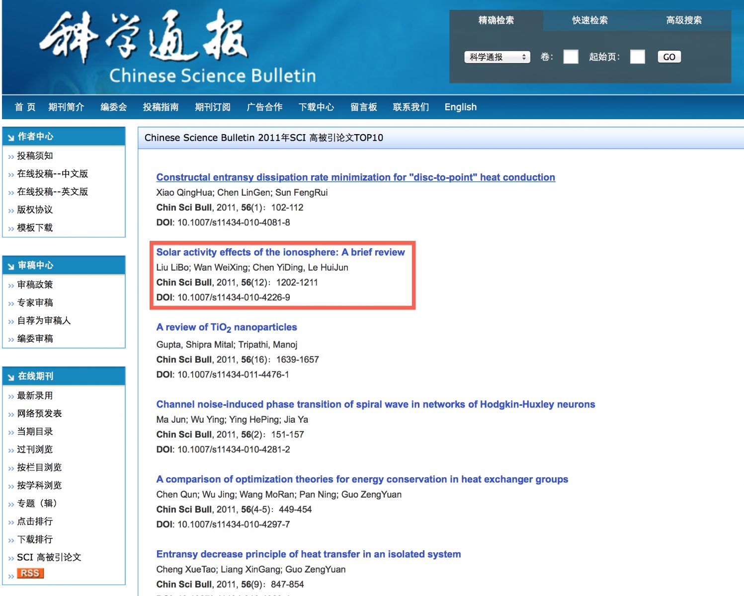 我室劉立波、萬衛(wèi)星、陳一定、樂會軍等撰寫的"太陽活動對電離層影響"綜述論文評為《科學通報》2011年度高引用論文的TOP10論文,位列第二名。
