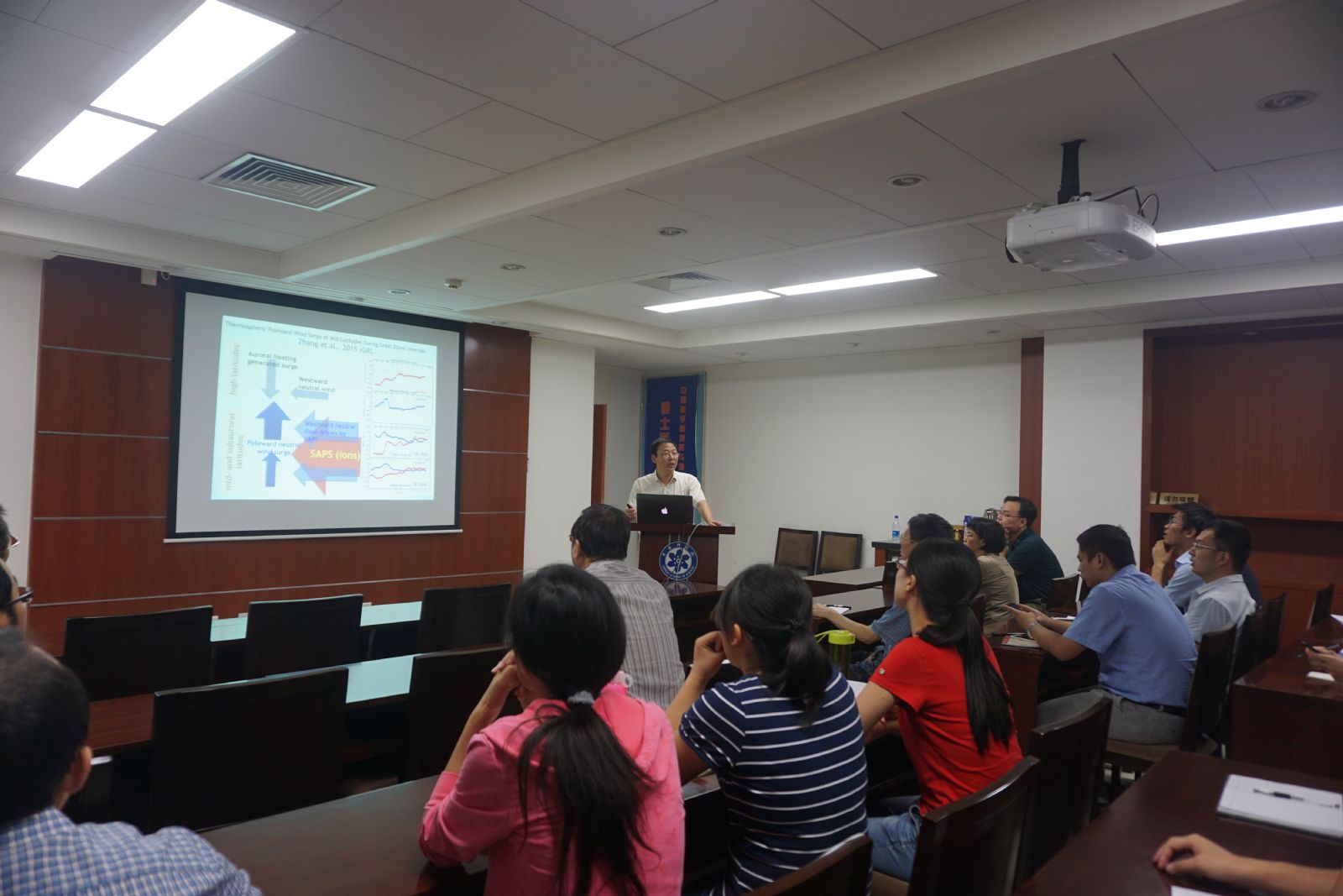 交流中,Shun-Rong Zhang研究員做了題為"Ion-neutral coupling during the March 2015 superstorm"和"Delayed upper atmospheric responses to solar EUV irradiation"的學術(shù)報告,介紹了雷達的相關(guān)情況和他近年來所取得的一些研究成果。2個多小時的報告會氣氛熱烈,聽眾們積極提問,針對報告中的具體問題與張教授進行了討論交流。