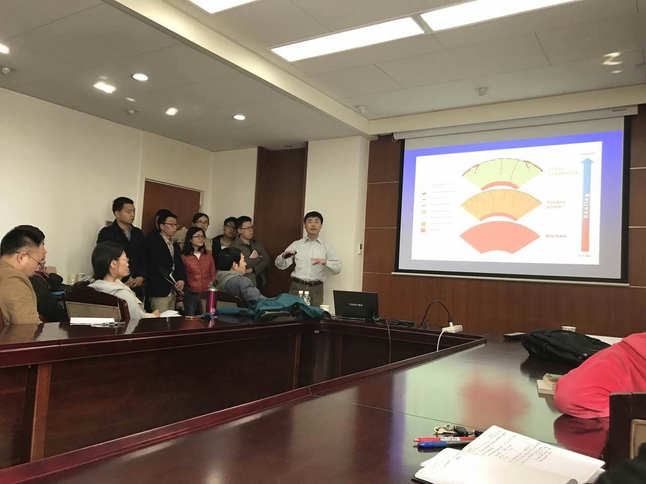 3月27日至29日,王克林研究員就地球動力學研究中的"Thermal structure of active continental margins(活動大陸邊緣的熱結(jié)構(gòu))"、"Fluid processes in the oceanic lithosphere and subduction zones(海洋巖石圈和俯沖帶的流體過程)"、"Stress and deformation at active continental margins(活動大陸邊緣的應(yīng)力和變形)"、"Observing and modeling deformation in subduction earthquake cycles(監(jiān)測與模擬俯沖帶地震周期的地形變過程)"等問題,結(jié)合基本要點回顧、概念辨析和前沿科學問題進行了系列講座。來自于海南、廣州和南昌等地的多名學者趕來參與系列講座活動,每場都有80人左右參與,幾乎擠爆了地3樓518會議室。