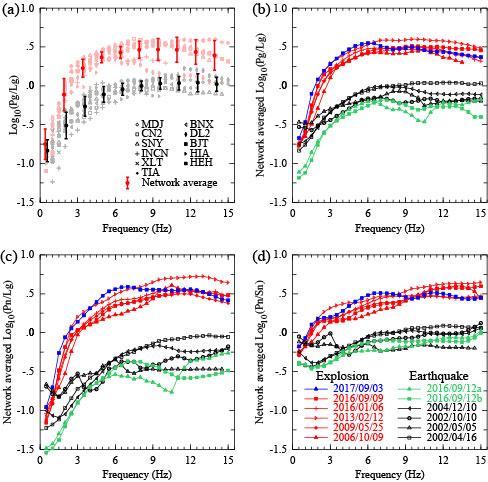 圖2 核爆與天然地震事件頻譜比的比較。(a)為單一事件單臺(tái)得到的Pg/Lg結(jié)果和對(duì)臺(tái)網(wǎng)的平均值。(b)-(d)為不同事件Pg/Lg,Pn/Lg,和Pn/Sn頻譜比的臺(tái)網(wǎng)平均值,紅色曲線來(lái)自歷史核爆,黑色和綠色曲線為天然地震,藍(lán)色曲線來(lái)自2017年9月3日的事件。該事件顯然落入爆炸事件的群組。