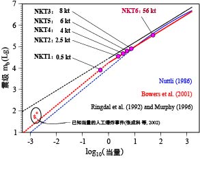 圖3用于估算朝鮮核試驗(yàn)當(dāng)量的經(jīng)驗(yàn)震級(jí)-當(dāng)量關(guān)系曲線。其中實(shí)線部分為以大量數(shù)據(jù)為基礎(chǔ)的關(guān)系曲線,虛線段為少量數(shù)據(jù)支持的延伸線;NKT1-5為5次歷史朝鮮地下核試驗(yàn),NKT6為本次爆炸事件。圖中紅色實(shí)心五角星是3個(gè)已知當(dāng)量的化學(xué)爆炸事件。