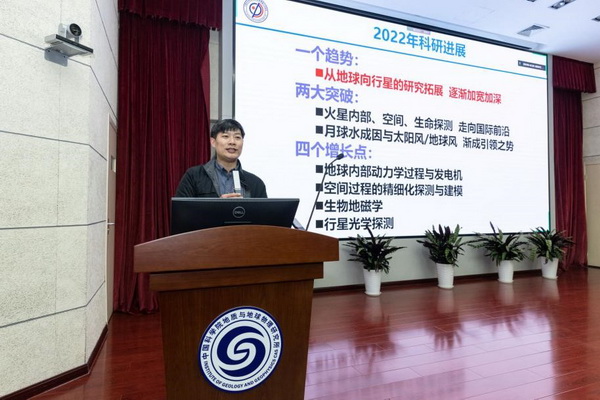 張小雷致辭并發(fā)言,他肯定了地星室在過(guò)去一年里取得的成績(jī),在深空探測(cè)、行星科學(xué)研究“集結(jié)號(hào)”已然吹響之際,號(hào)召大家將科研工作與國(guó)家戰(zhàn)略需求緊密結(jié)合,義無(wú)反顧投身到國(guó)家急切需求的行星科學(xué)領(lǐng)域。實(shí)驗(yàn)室主任魏勇研究員代表實(shí)驗(yàn)室作總結(jié)報(bào)告,分別就實(shí)驗(yàn)室基本概況、2022年科研進(jìn)展、2023年工作計(jì)劃等三個(gè)方面向委員們作了詳細(xì)的匯報(bào)。首先重點(diǎn)介紹了實(shí)驗(yàn)室在申請(qǐng)全國(guó)重點(diǎn)實(shí)驗(yàn)室方面開(kāi)展的工作和取得的進(jìn)展,并簡(jiǎn)要介紹了實(shí)驗(yàn)室在行星科學(xué)學(xué)科建設(shè)、人才隊(duì)伍成長(zhǎng)、重要研究成果等方面的情況;隨后向各位委員介紹了實(shí)驗(yàn)室一年來(lái)科研方面取得的重要進(jìn)展,概括為下面幾個(gè)特點(diǎn)。一個(gè)趨勢(shì):從地球向行星的研究拓展并逐漸加寬加深;兩大突破:火星內(nèi)部、空間、生命探測(cè)等走向國(guó)際前沿,月球水成因與太陽(yáng)風(fēng)/地球風(fēng)等漸成引領(lǐng)之勢(shì);四個(gè)增長(zhǎng)點(diǎn):地球內(nèi)部動(dòng)力學(xué)過(guò)程與發(fā)電機(jī)、空間過(guò)程的精細(xì)化探測(cè)與建模、生物地磁學(xué)、行星光學(xué)探測(cè)。最后對(duì)2023年工作進(jìn)行了規(guī)劃和展望,重點(diǎn)是加緊推進(jìn)全國(guó)重點(diǎn)實(shí)驗(yàn)室重組工作。隨后李國(guó)主研究員、姜明明副研究員以及李超博士后分別作了題為“注入地球空間的地外物質(zhì)特征和來(lái)源初步探測(cè)研究”、“新特提斯洋雙俯沖模式的地震學(xué)觀測(cè)證據(jù)”和“祝融號(hào)巡視雷達(dá)首次揭秘火星烏托邦平原淺表結(jié)構(gòu)”的亮點(diǎn)成果報(bào)告,向委員們展示了實(shí)驗(yàn)室在逐夢(mèng)行星科學(xué)道路上的不懈努力和取得的成果,體現(xiàn)了積極參與國(guó)家深空探測(cè),踔厲奮發(fā),勇做國(guó)家隊(duì)、做國(guó)家事的精神面貌。